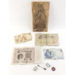 Mixed lot. St. URSULA wall plaque. Small silver viniagrette box, Aria salt spoon, German banknotes, Israeli 1958 banknotes, Haile Selassie coin etc.`