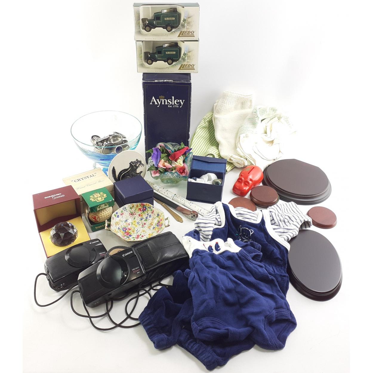 Mixed ornamental lot. To include Swarovski small crystal animals, a small collection of WOODSETTON lidded boxes, two old cameras, diecast vehicles, Aynsley vase, dolls clothes etc.