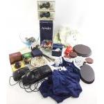 Mixed lot. Stoneware jug marked damson Edinburgh, Spirit of Scotland book shape decanter, Wooden pen holder, dress brooch and a pair of wooden reindeer (A/F). Includes some boxed USB adaptors and plugs.