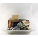 A tub full of useful fishing accessories such as two reels, many lures, hooks, weights and lots of handy wee tins with contents.