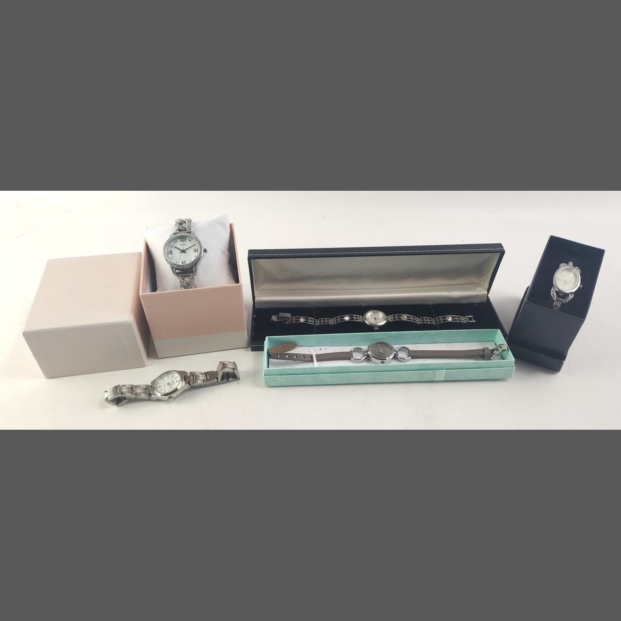 Four boxed modern ladies BLING dress cocktail watches. Pretty pieces, batteries may be required. Also one loose watch.
