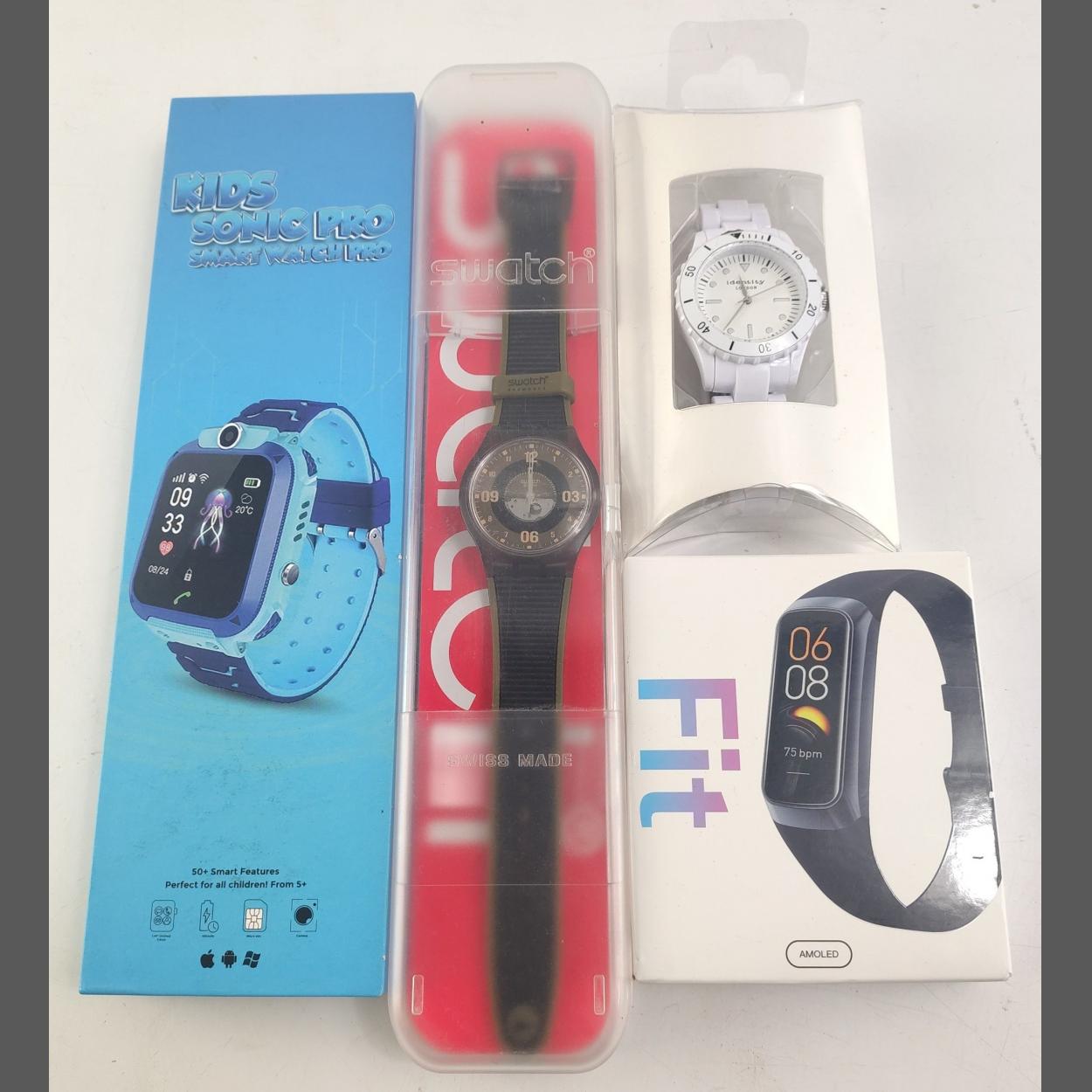 Four modern boxed timepieces. To include a FIT Smart Band, A Kids Sonic Pro, A SWATCH and an Identity. All boxed untested.