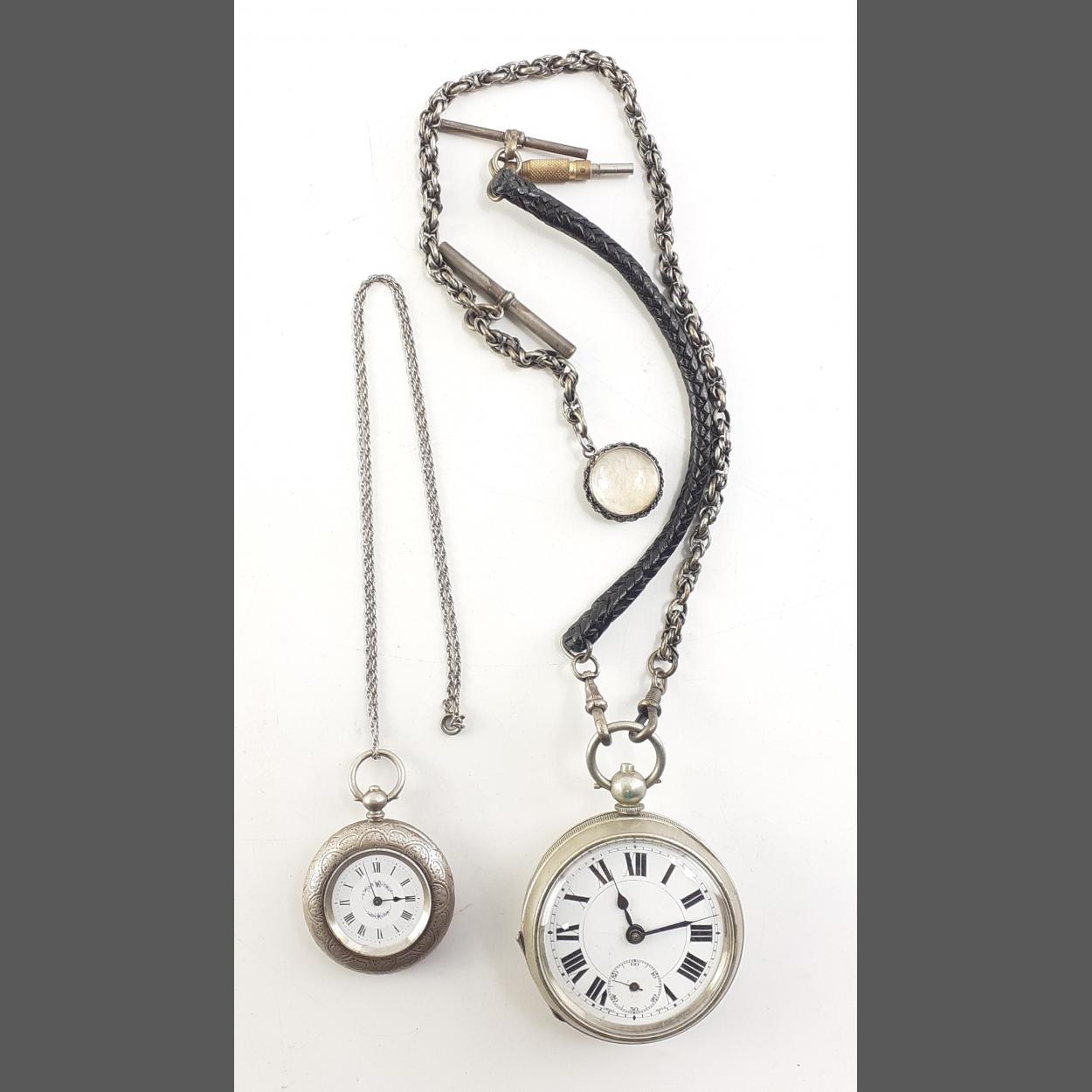 A large white enamel faced gents fob watch on steel albert with compass fob and winder key. Also a small Silver cased fob watch. Neither running.