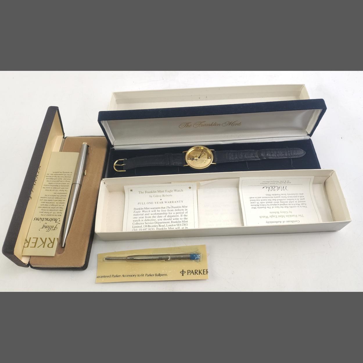 A FRANKLIN MINT eagle watch in case (battery required) and a case PARKER ballpoint.