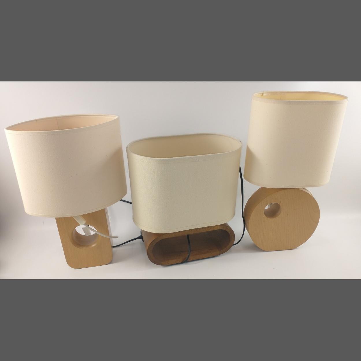 Three contemporary table lamps with wooden bases standing 33, 40 and 43cm tall