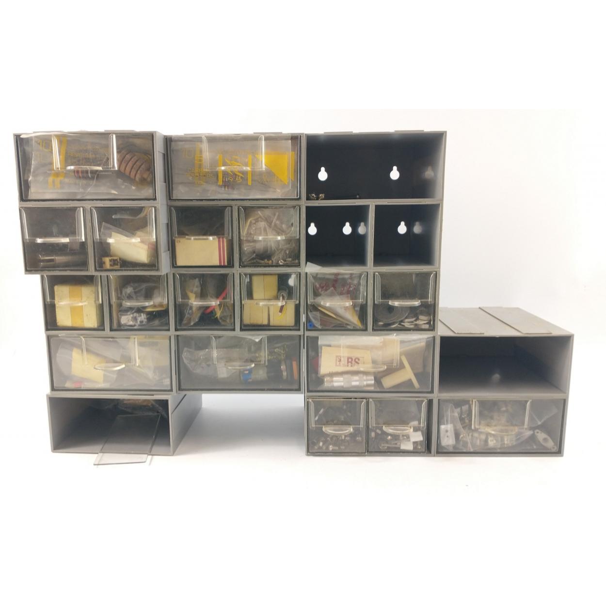 A NIK NAKS set of small grey plastic storage boxes - came from a vintage radio's and TV's mostly enthusiast work area - 48cm long x 29cm high approx
