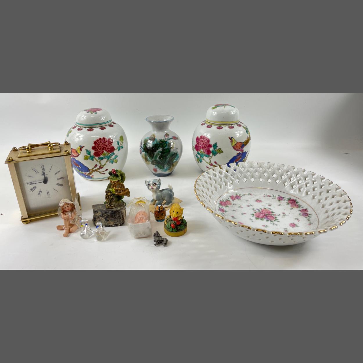 A mixed china collection to include a HIGHLAND STONEWARE vase (14cm tall), a vintage ESTYMA, quartz CARRIAGE CLOCK (12cm tall), a pair of oriental ginger jars (16cm high, 1 has repaired damage to the lid), a pierced bowl from M&S (23cm dia), a bag of small decorative objects including a Land's End pixie, a Tetley field mouse (1997), a French horn playing frog,a guardian angel