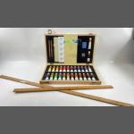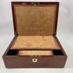A wooden writing slope outer densions 30x23x12cm, Inside the writing slope (35x25cm) has a replacement suede cover as has the container for pens etc.