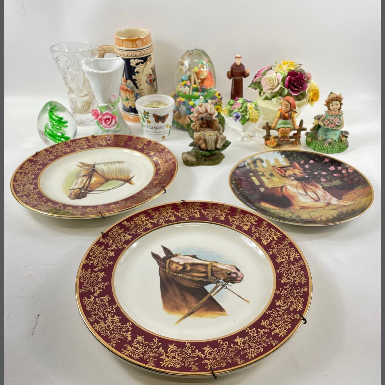 A mixed decorative lot to include a vintage MUSICAL WATER SNOW GLOBE of an Easter Rabbit EGG HUNT (16cm high), 2 hanging plates of horses heads by WEATHERBY (26cm approx), a Danbury Mint plate 'Patience' (20cm approx), an ADDERLEY posy (13cm with some damage), an ADDERLEY floral wheelbarrow (8cm with a little damage), a Caithness-style egg-shaped paperweight 10cm high, a fairy from the LEONARDO COLLECTION (10cm), a Baby Hetty from the 'Hedgies' collection, a 'Just Resting' figure from the GOEBBEL/HUMMEL COLLECTION (10cm), a stein from Attendorn, etc