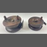 Two vintage wooden fishing reels each 9cm and 10cm diameter