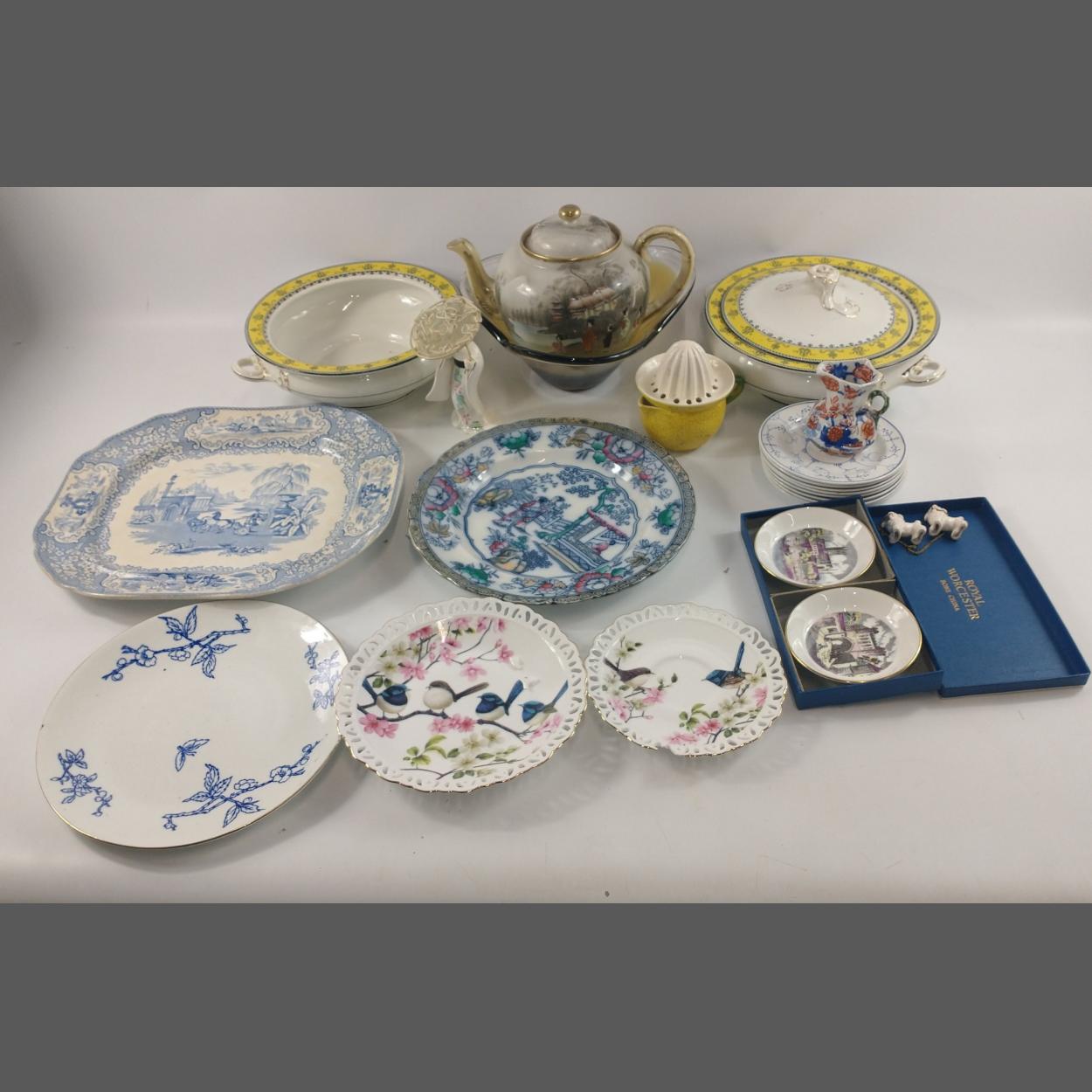 A mixed decorative china lot to include 6 VILLEROY nd BOCH saucers (13cm), a Wm ADAMS Chinese Ching plate (26cm), a 33cm blue and white ashet, 2 vintage BEIDGWOOD ANCHOR serving dishes (23cm), 1 with lid a large Oriental teapot, a pair of ROYAL WORCESTER boxed trinket dishes etc