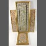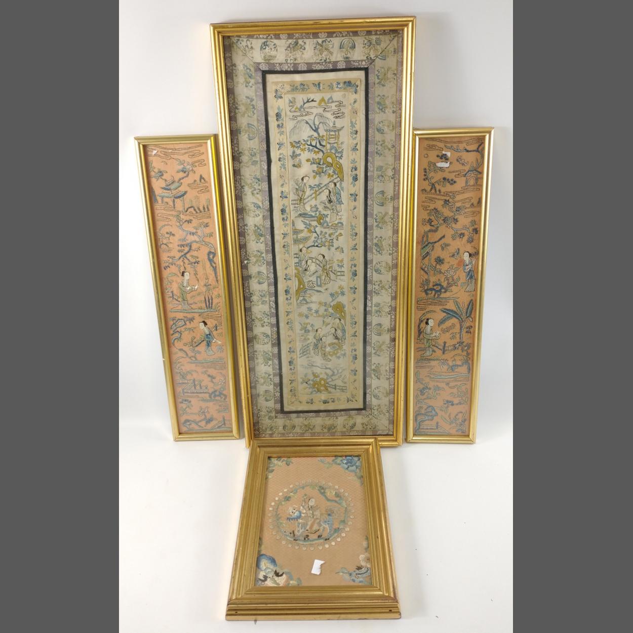 A collection of HAND-EMBROIDERED ORIENTAL SILK PAINTINGS of a person on a dragon 29 x 22cm, ladies in a garden 67 x 27cm, plus 2 pictures 52 x 12cm of ladies in a garden