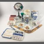 A mixed box to include 5 cut glass bowls, a hand-painted Tazza by M Needham (9cm tall), miniature tea set in white and with a gilt design comprising 4 cups (6cm dia), 4 saucers (10.5cm dia, 1 damaged), a teapot (10cm tall), a milk jug and sugar bowl (9cm dia, slight crack) plus a KAISER STRASBOURG lidded bowl with tongs (6cm dia), plus 1 other mini service by RIDGWAYS BURLEIGH including 6 plates (10cm), 2 lidded dishes (11.5cm tiny chip from one)and a mini sauceboat etc