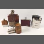 Collection of drinking memorabilia. To include two plated bottom glass hip flasks, one with alligator style (H: 17cm approx), other leather style. Also includes Lichfield leather curved hip flask (H: 10cm approx), unusual Jerry can style hip flask in leather case(H: 10cm approx) and set of 3 shot glasses in leather pouch from John Maguire, Edinburgh