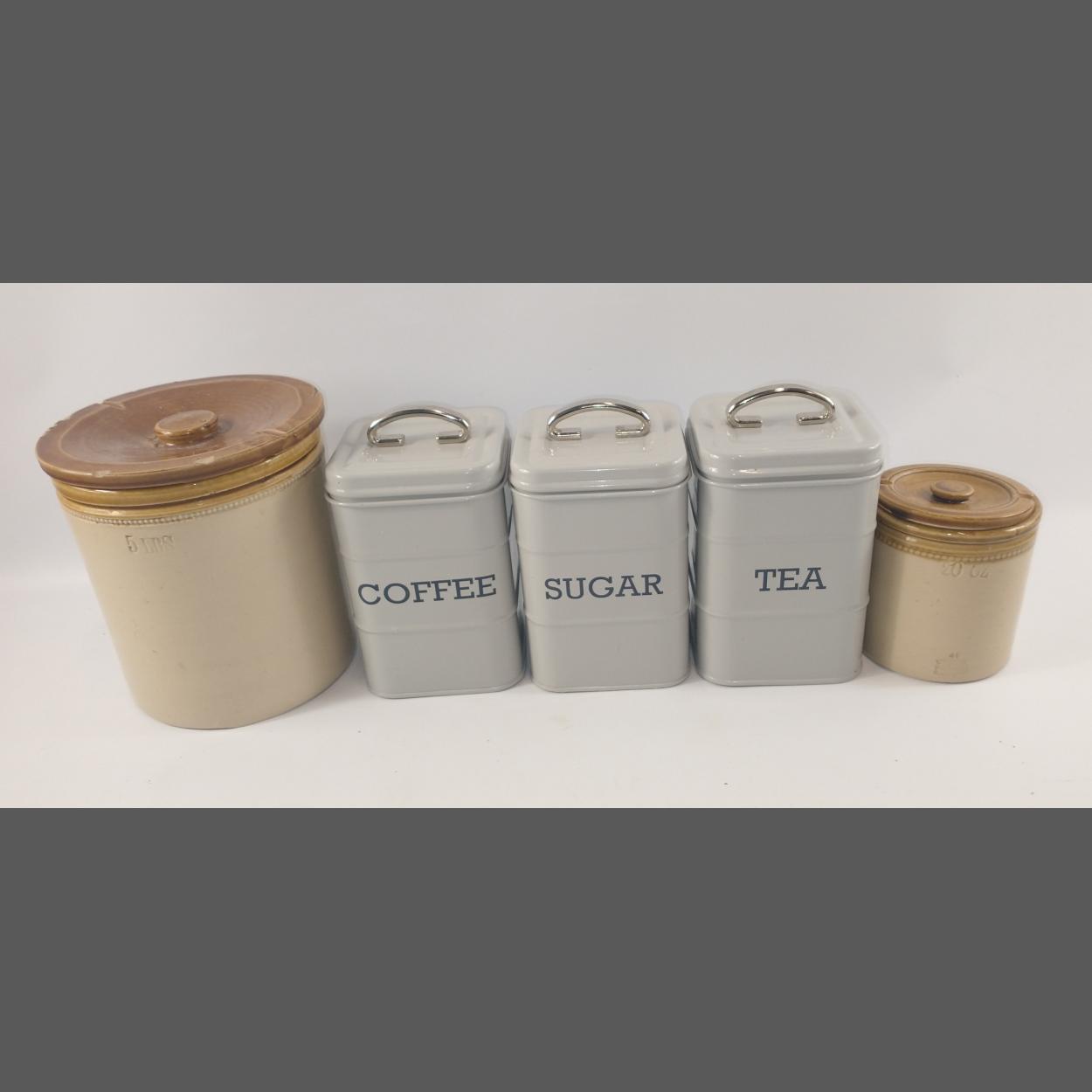 Kitchen storage both retro and modern - 3 sleek grey tins for coffee, sugar and tea (19cm high) plus 2 stoneware jars one for 5lbs and the other stamped Buchan, Portobello, Edinburgh for 20oz.