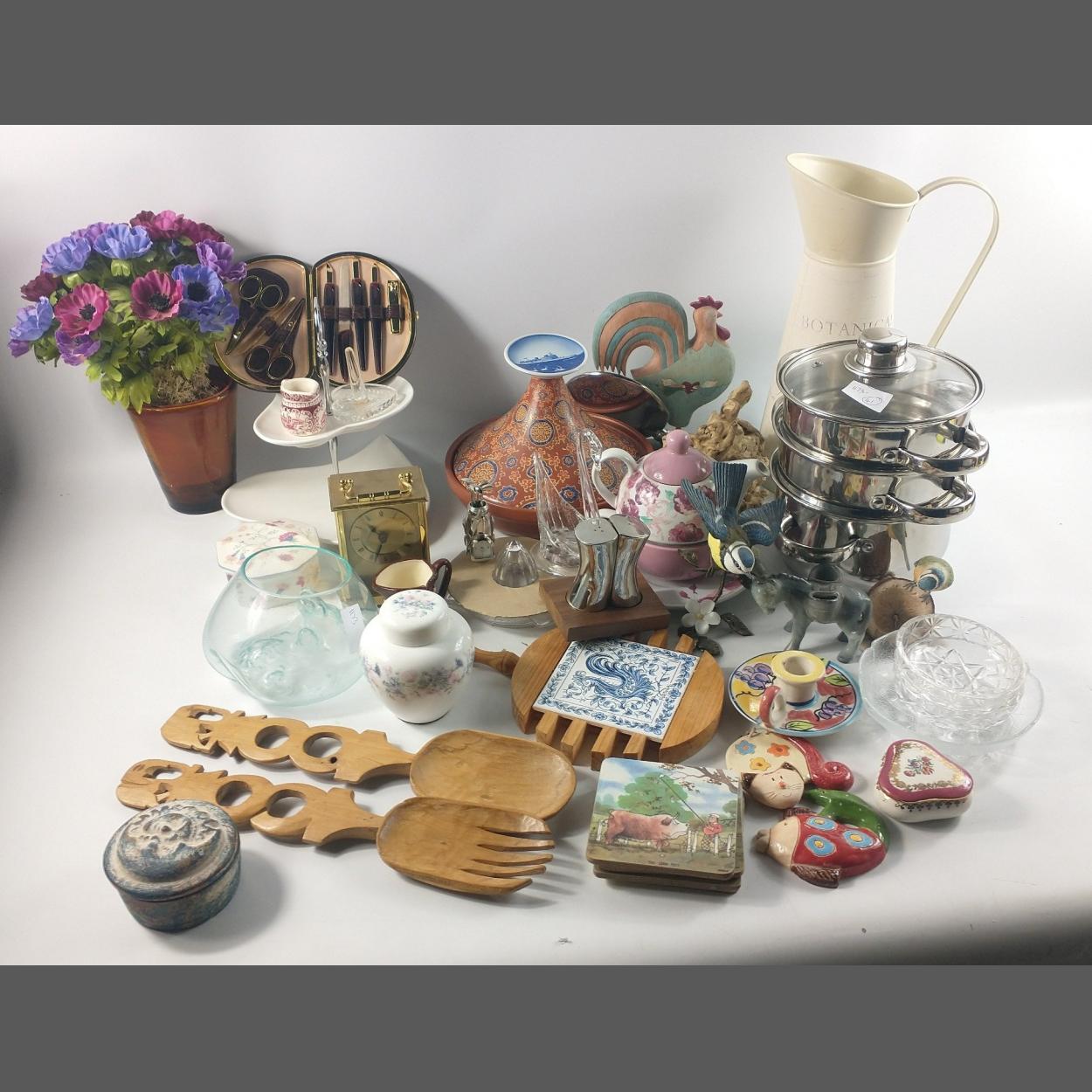 A mixed homeware lot to include a 3 tier CULINARY PRO by Pilot steamer (18cm dia), a tagine by LAKELAND (22cm dia), a large metal jug (33cm tall), a glass lemon squeezer, salt and pepper, coasters, trivet teapot/cup/saucer for one etc