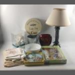 A mixed lot to include 'Miao-yu', plate 5 in the Beauties of the Red Mansion series, a white M&S bowl (23cm), a small aluminium watering can, a large cake tin (26cm dia, 10cm high), an ANITA HARRIS tulip vase (has some damage), 6 M&S champagne flutes, 8 cream fabric placemats, 4 teatowels, an unopened 500 piece jigsaw puzzle 'Topping Up' and a table lamp