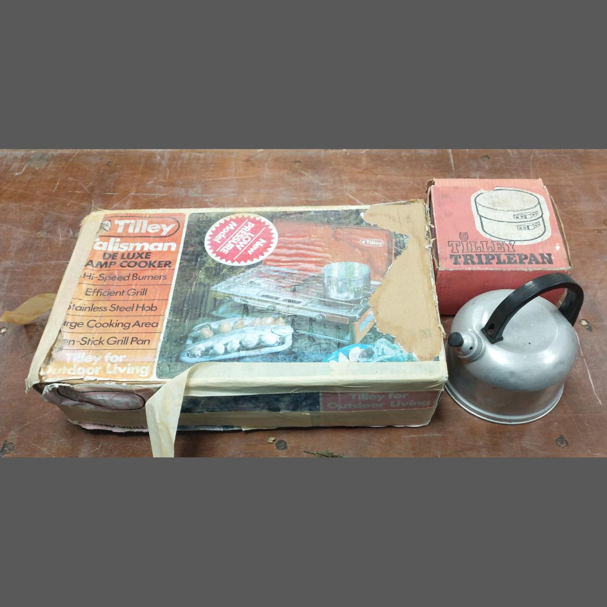A TILLEY TALISMAN camping cooker, two burner, with in-built grill and a kettle, 3 in 1 pan set by TILLEY, still in original box,