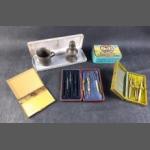 A small collection of items of interest to include cased draughtsman set, cased sewing set, gilt cigarette case, small Royal Holland Pewter measure and a pewter sifter. Also includes a Players cigarette tin and an empty case.