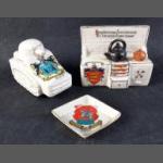CRESTED CHINA with a Borders and WWI interest. The Home Fires with PEEBLES crest, The Tank with MOFFAT crest and a small pin tray with JEDBURGH crest. All in good undamaged condition.
