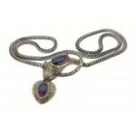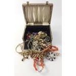 A small jewellery box with a dop-down front and snake-style covering with contents of stylish costume jewellery