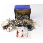 A mixed collection of costume jewellery to include a pewter seahorse, necklace and earrings sets, scarf clips, brooches etc
