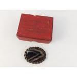 An old H Samuel jewellery box containing a rather pretty polished agate base metal mounted 5cm brooch.