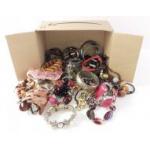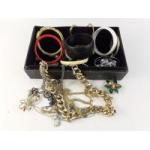 A black faux leather jewellery box (25x14x8cm approx) filled with chunky bangles and chains (box slightly scuffed)