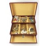 A two tier jewellery box with pull-out drawer complete with contents of brooches of all shapes and sizes 25x18x10cm approx