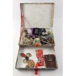 A mixed box to include a tooled trinket box (8x6x4cm approx), various cigarette cards, a Edward VII and Alexandra 1902 coronation medallion and some boxed costume jewellery