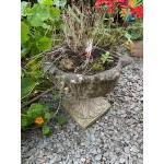 One of a pair of stone-effect floor standing garden urns standing 35cm tall x 40cm diameter approx - comes in 2 pieces for ease of transport etc - comes complete with planting of geraniums etc