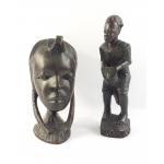 Two carved African figurines. One of the head of a young girl (approx 20cm high), the other a man playing a drum stands approx 23cm high)