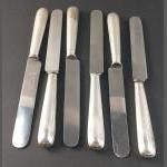 Six large silver handled filled knives. Each 24cm long with stainless steel blades. Hallmarks well rubbed. Total gross weight 478g approx.