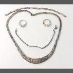 A collection of 925 stamped silver jewellery including a Greek key chain necklace approx 45cm long, a bracelet (19cm long approx) set with clear stones (3 missing), an identity bracelet 19cm long, a ring stamped 925 (size J) set with 5 cubic zirconia stones, a ring stamped 925 (size K) set with 5 cubic zirconia stones, total gross weight 50.90g approx