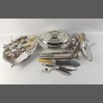 A mixed lot of silver plate to include super high quality mother of pearl style handled cutlery, two large serving plates and others.