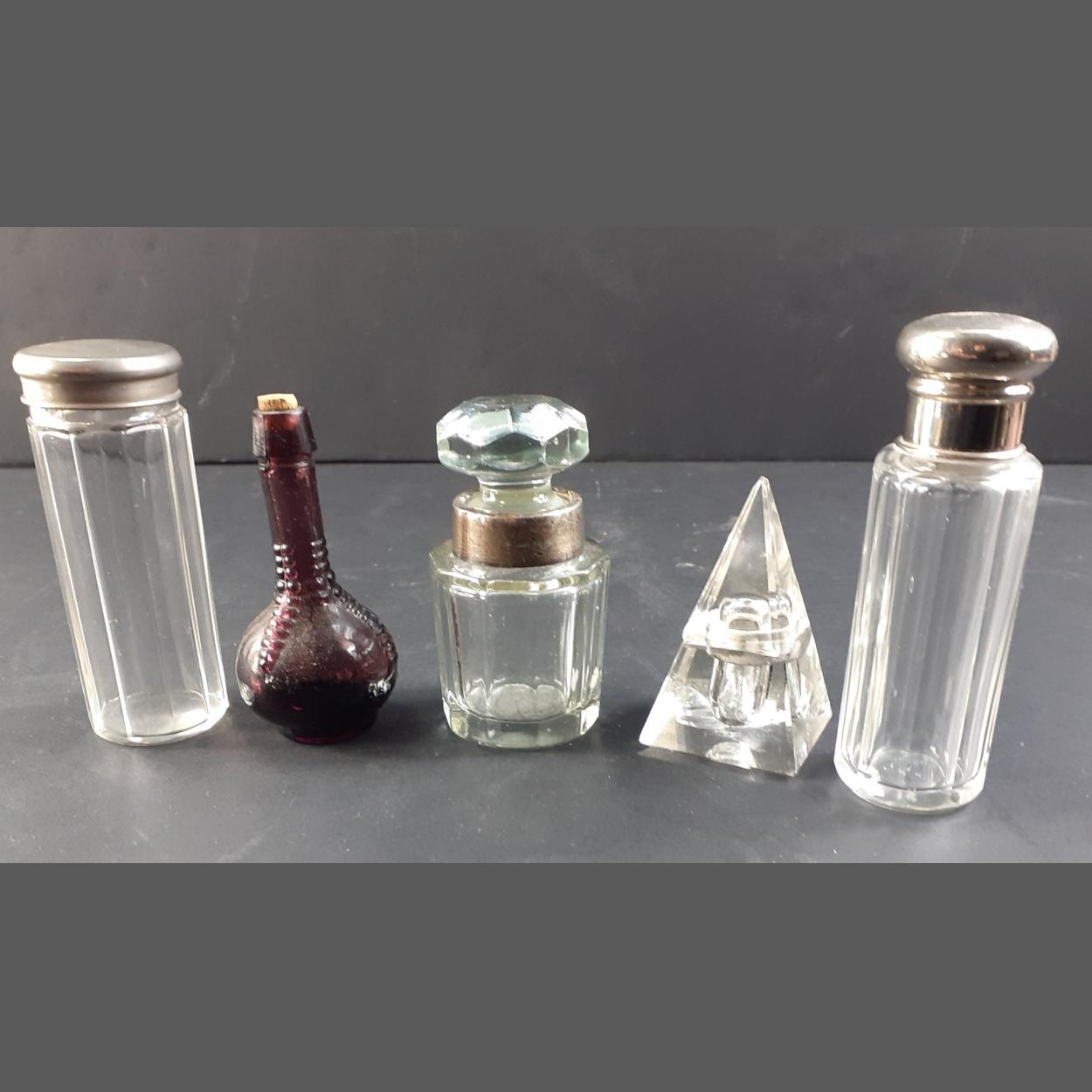 A collection of five glass bottles, 2 with white metal lids both approx 10cm high, one with white metal collar with glass stopper 8cm high, a pyramid shaped inkwell 7cm high (damaged base) and a brown Italian bottle with cork stopper 8cm tall