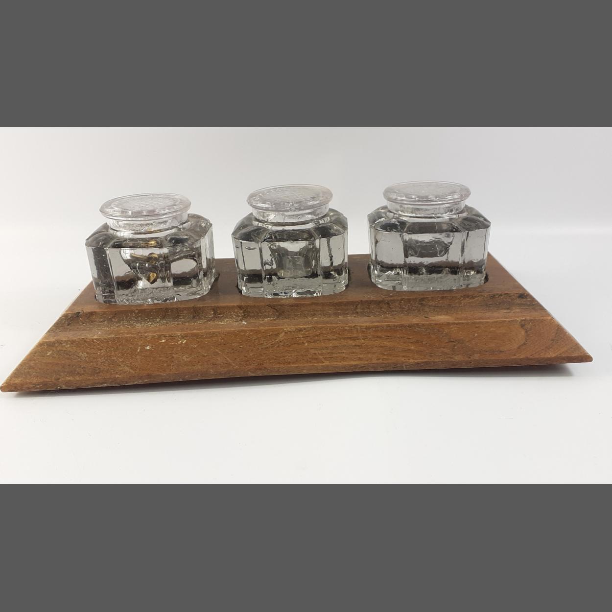 A novel desk or dressing table tidy comprising a wooden plinth with 3 inset spots for the heavyweight lidded cut-glass pots each 6x6x6cm and with a runnel at the front of the piece for pens, combs etc. Plinth measures 30x16cm. The inner lids on each have a few chips which do not detract from this lot