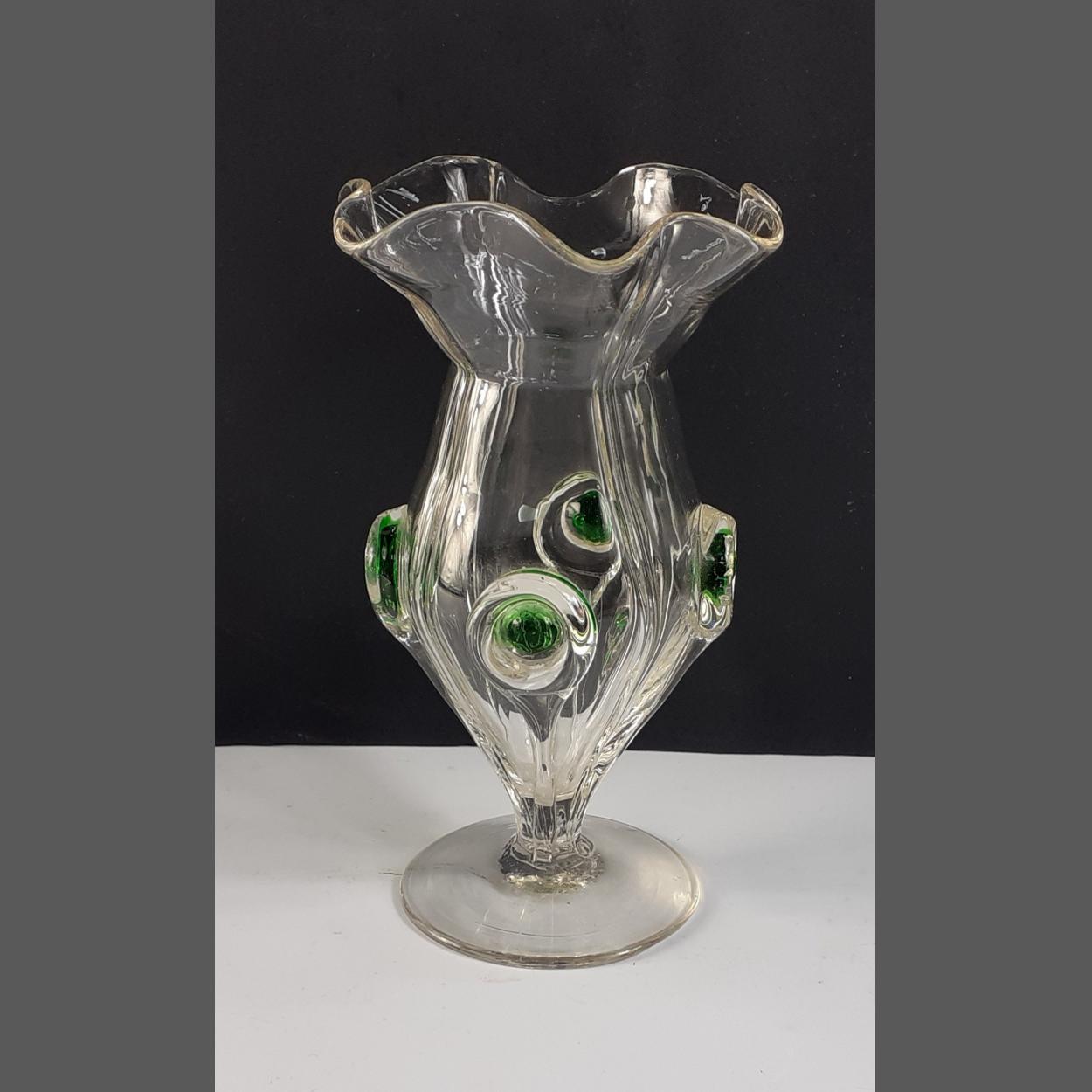 A beautiful Art Nouveau Stuart & Sons Green Peacock Eye trailed glass vase ca. 1900. Minor chip to the foot. Stands 13cm high approx. A very pretty and intricate little item.