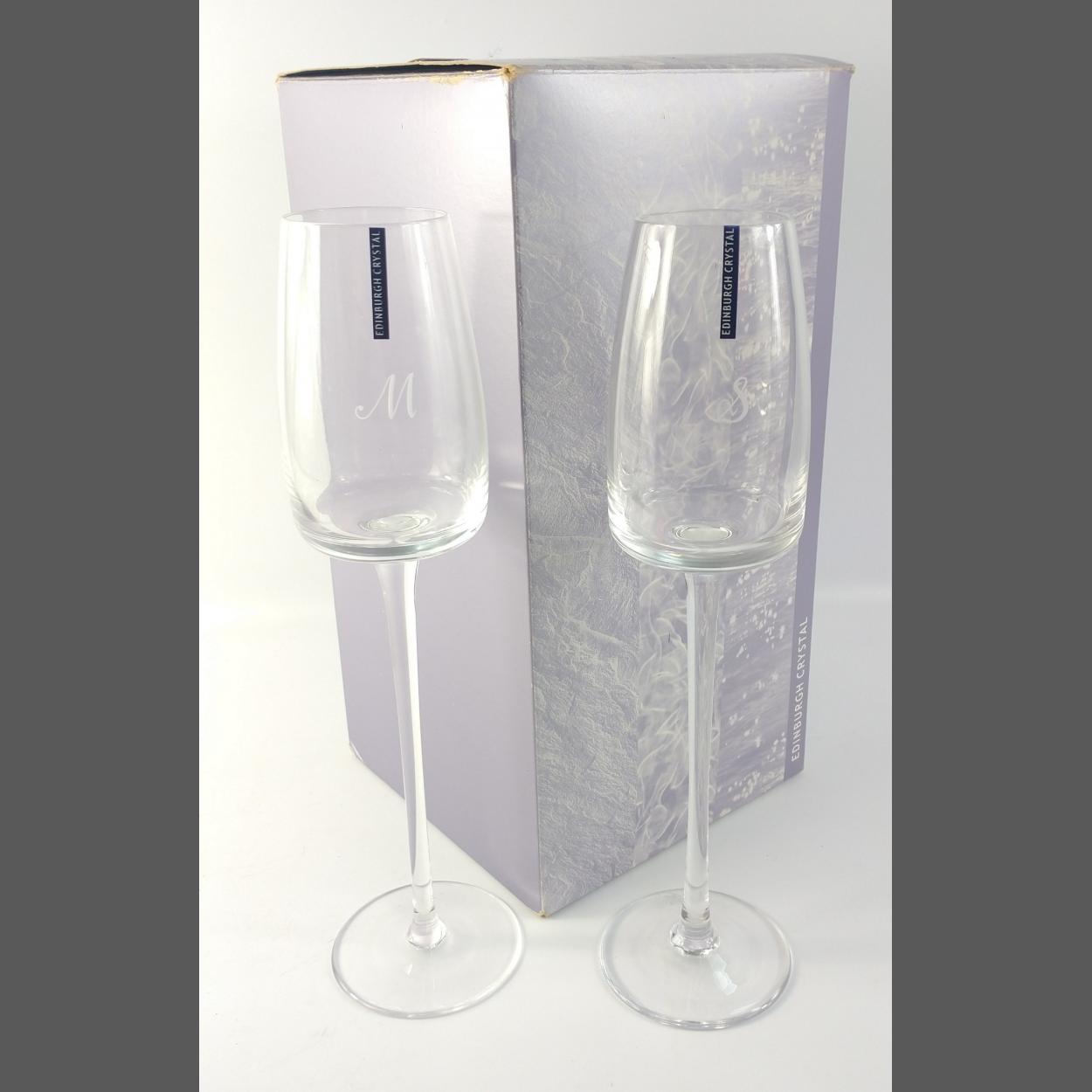 EDINBURGH CRYSTAL - 2 long-stemmed wine glasses in an Edinburgh Crystal presentation box. Height is approx. 30cm. The glasses are engraved with initials S and M respectively.