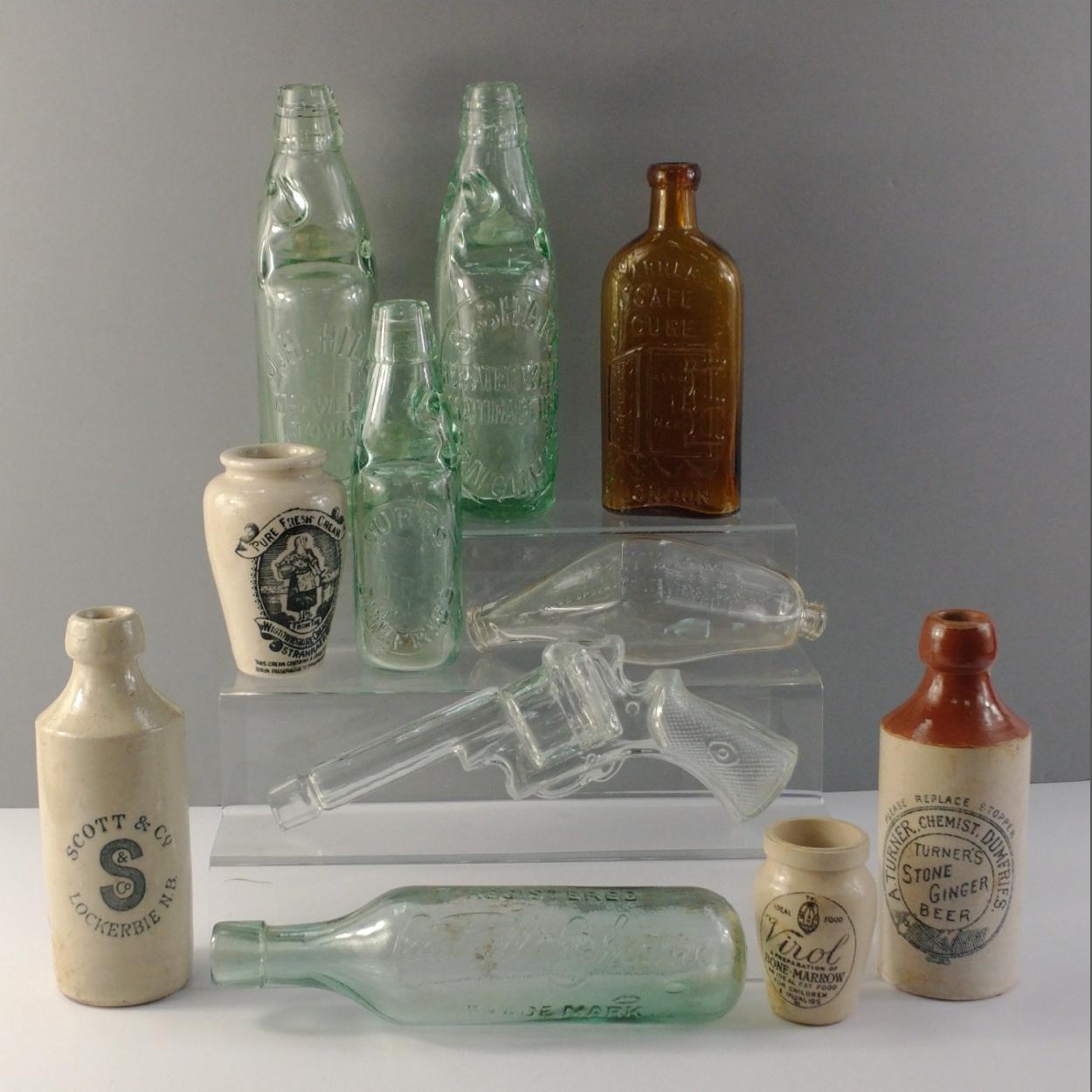 A nice glass and stone ware bottle collection to include three Codd bottles named to Dumfries and Sanquhar. Also Dumfriesshire stone bottles, a feeder bottle and a modern glass gun. All in good collectible order.