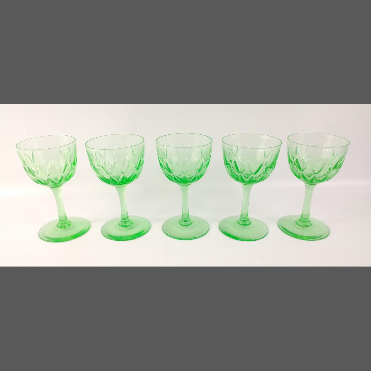 Five Uranium glass style wine glasses each 13cm high. Two with chips to base