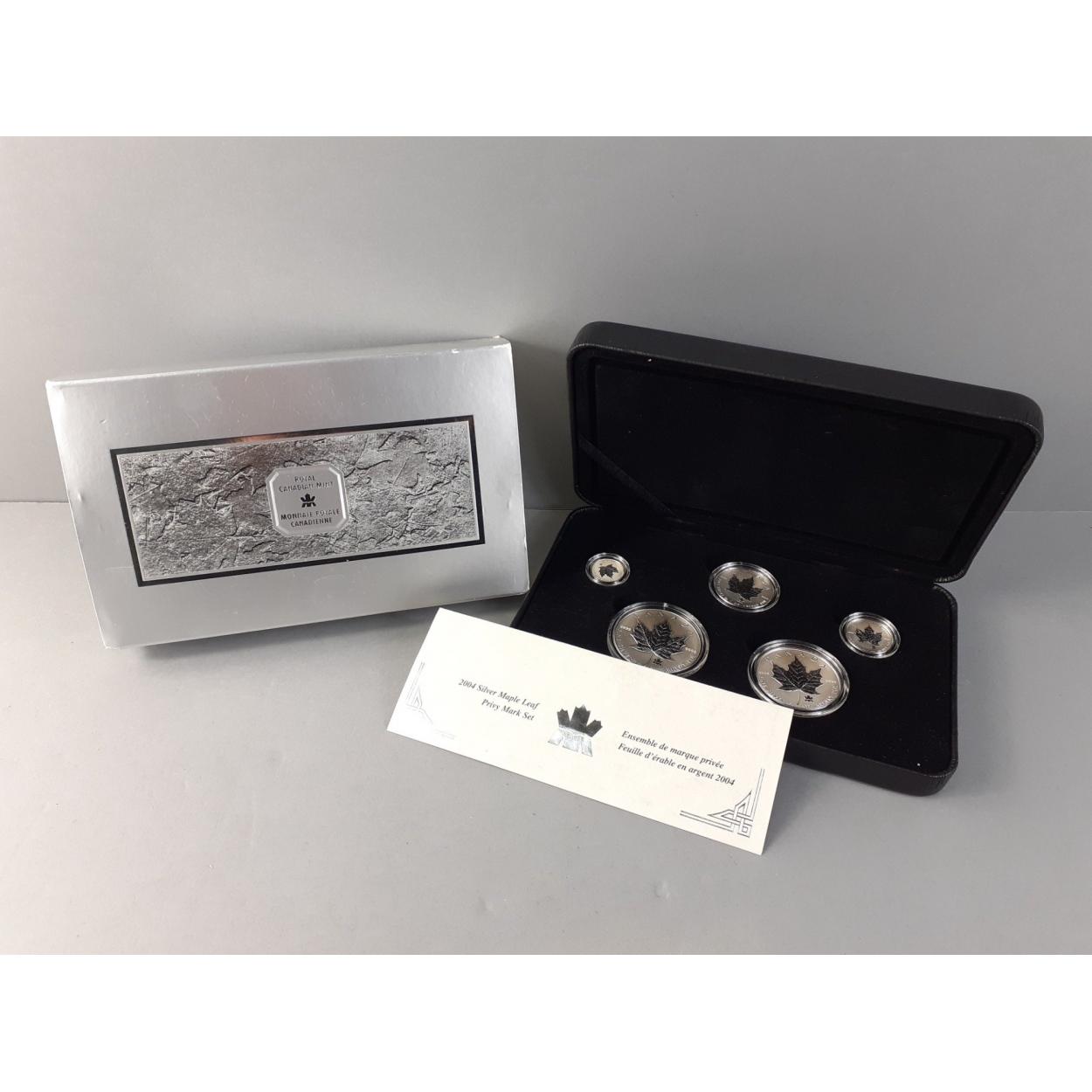 A ROYAL CANADIAN MINT five coin silver maple leaf privy mark proof set. Five beautiful .999 fine silver coins as issued just over 2 ounces in weight with certificate of authenticity in slip case