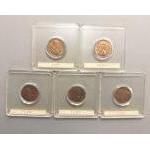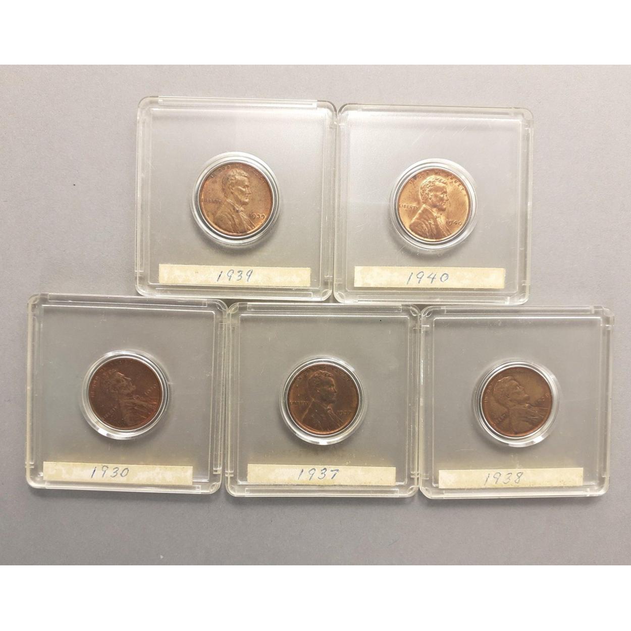 USA COINS! A lovely collection of good grade American One Cent Lincoln Head coins with Wheat Ear reverse. Presented in older coin holders. 1930, 1937, 1938, 1939 and 1940. Coins in good grades with toning. May have minor wear.