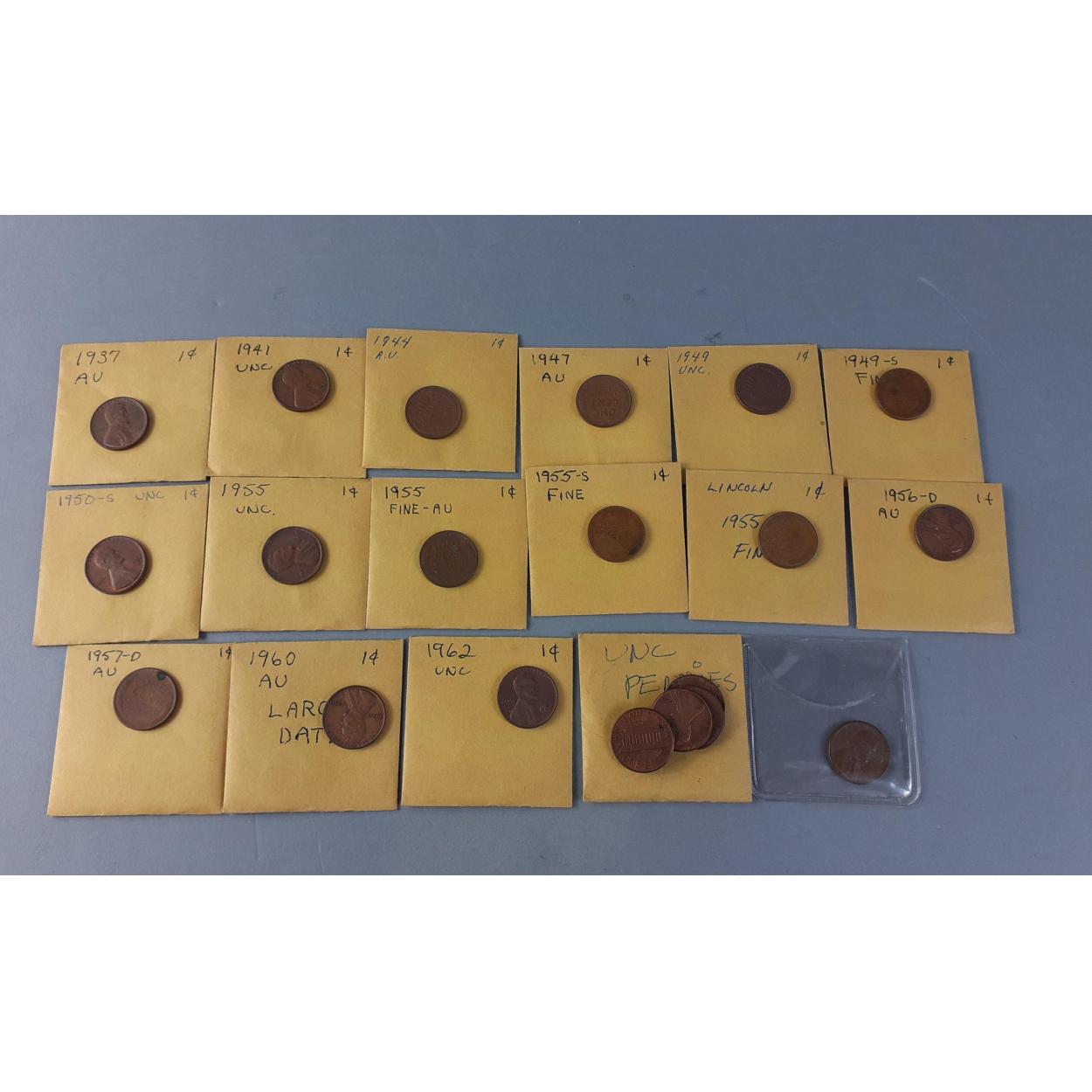 A selection of collectable UNITED STATES one Cent Lincoln Head coins. All in good collectable grades. Some appear uncirculated to include 1937, 1941, 1944, 1949, 1949s, 1950s, 1955 x 2, 1955s x 2, 1956d, 1957d, 1960 and 1962. A lovely little collection for the US enthusiast!