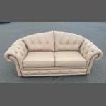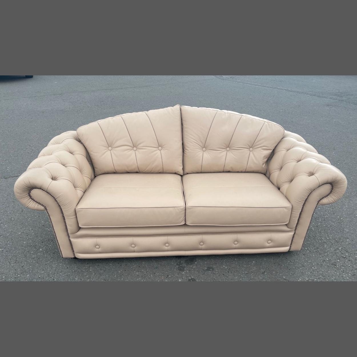 A NICE QUALITY DEEP BUTTONED three piece suite in light brown/beige to include a three piece sofa and two armchairs - they are all in great condition with the sofa being almost 'never sat on'!