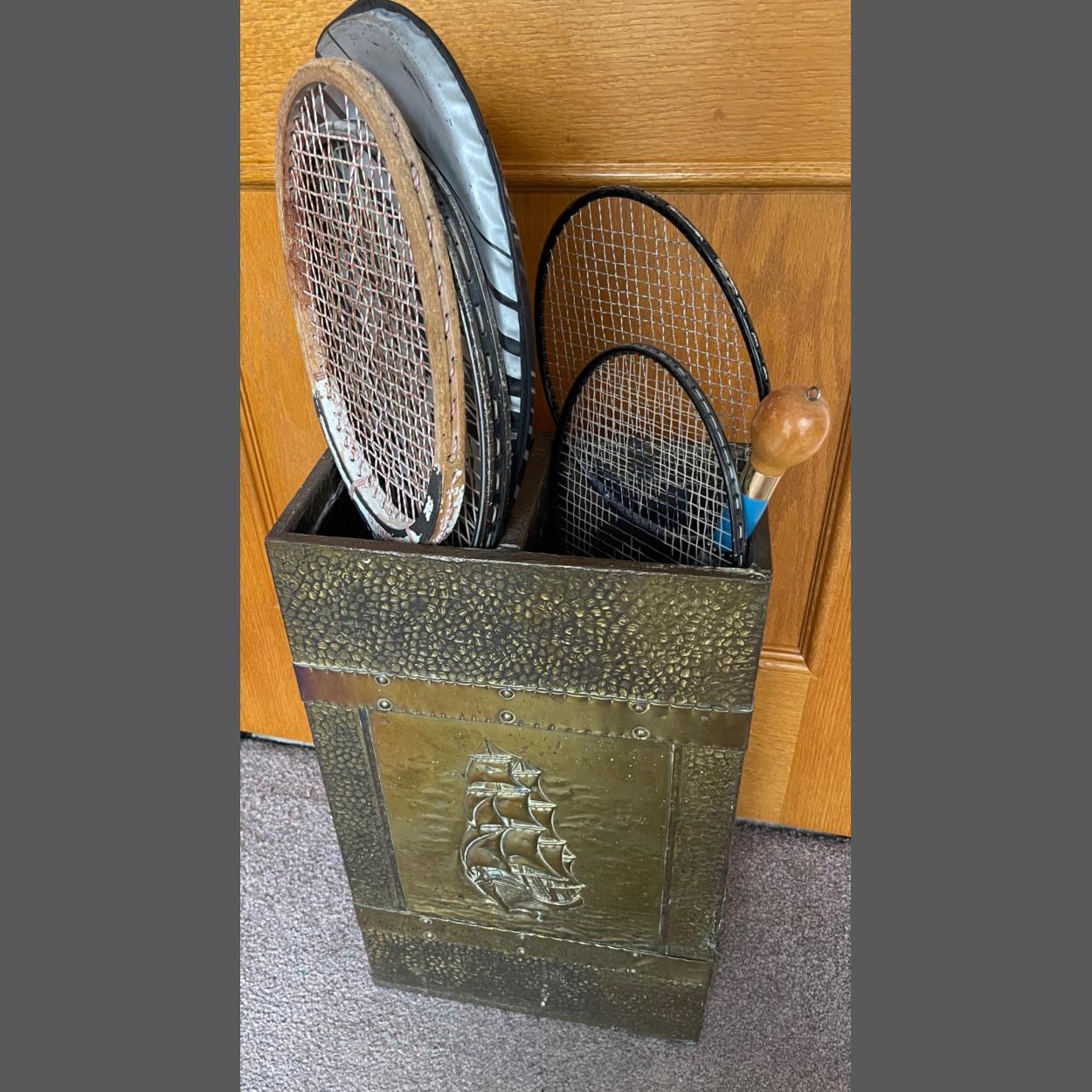 A nice vintage BRASS porch or hall stick stand with a repousse galleon ship design on the front panel - to include contents