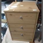 A modern three drawer bedside cabinet in light wood finish. Stands 60cm tall and in good order.
