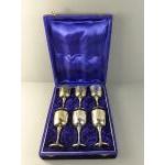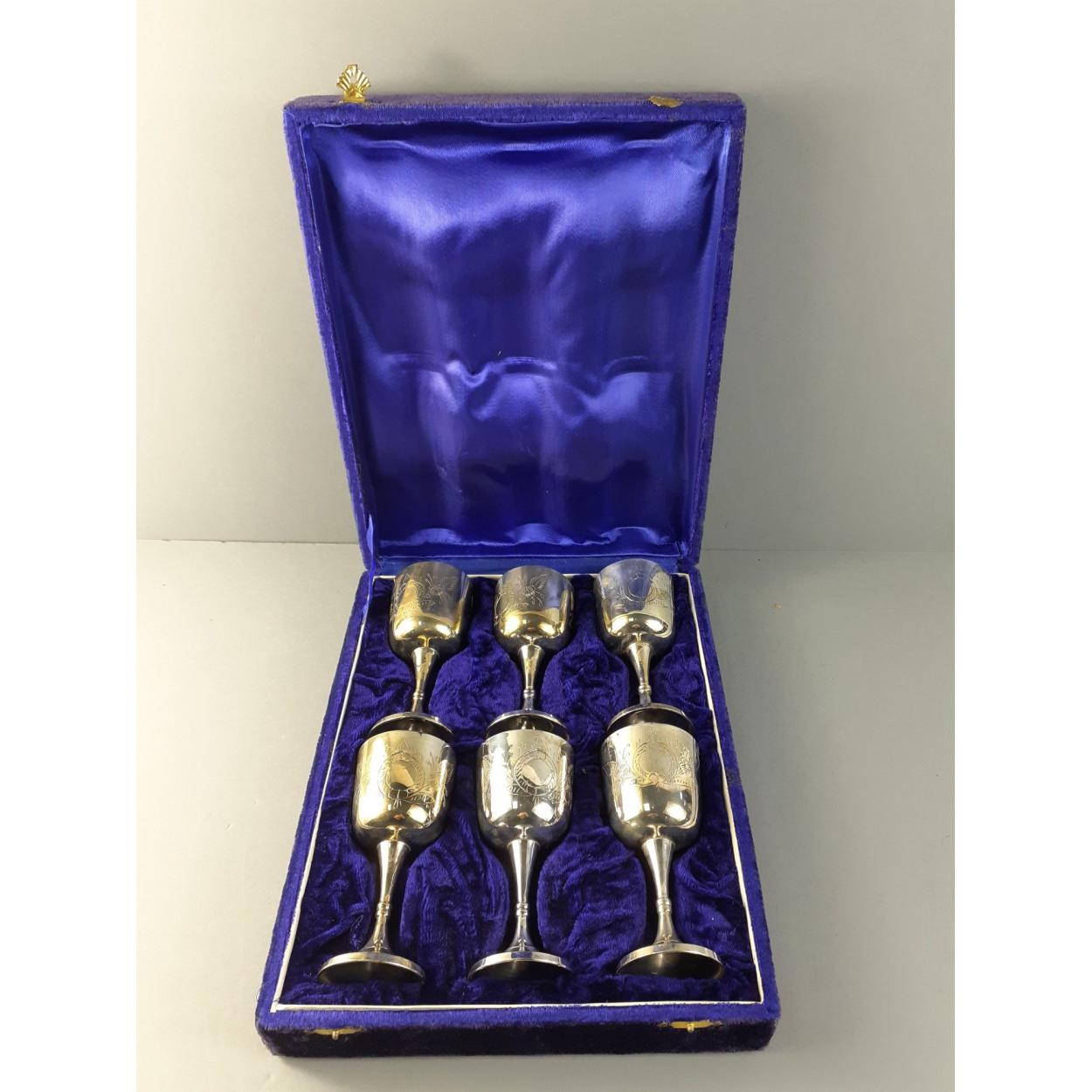 A set of six engraved EPNS goblets in a blue velvet lined presentation box