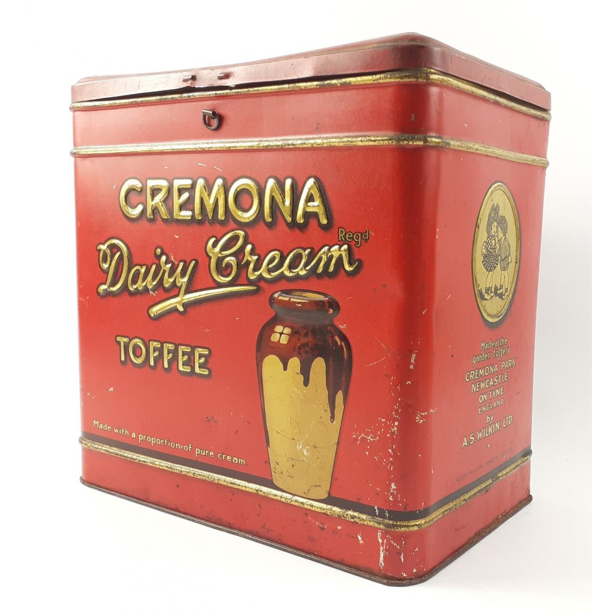A characterful vintage tin advertising CREMONA DAIRY CREAM TOFFEE measuring W28xD17xH28cm approx