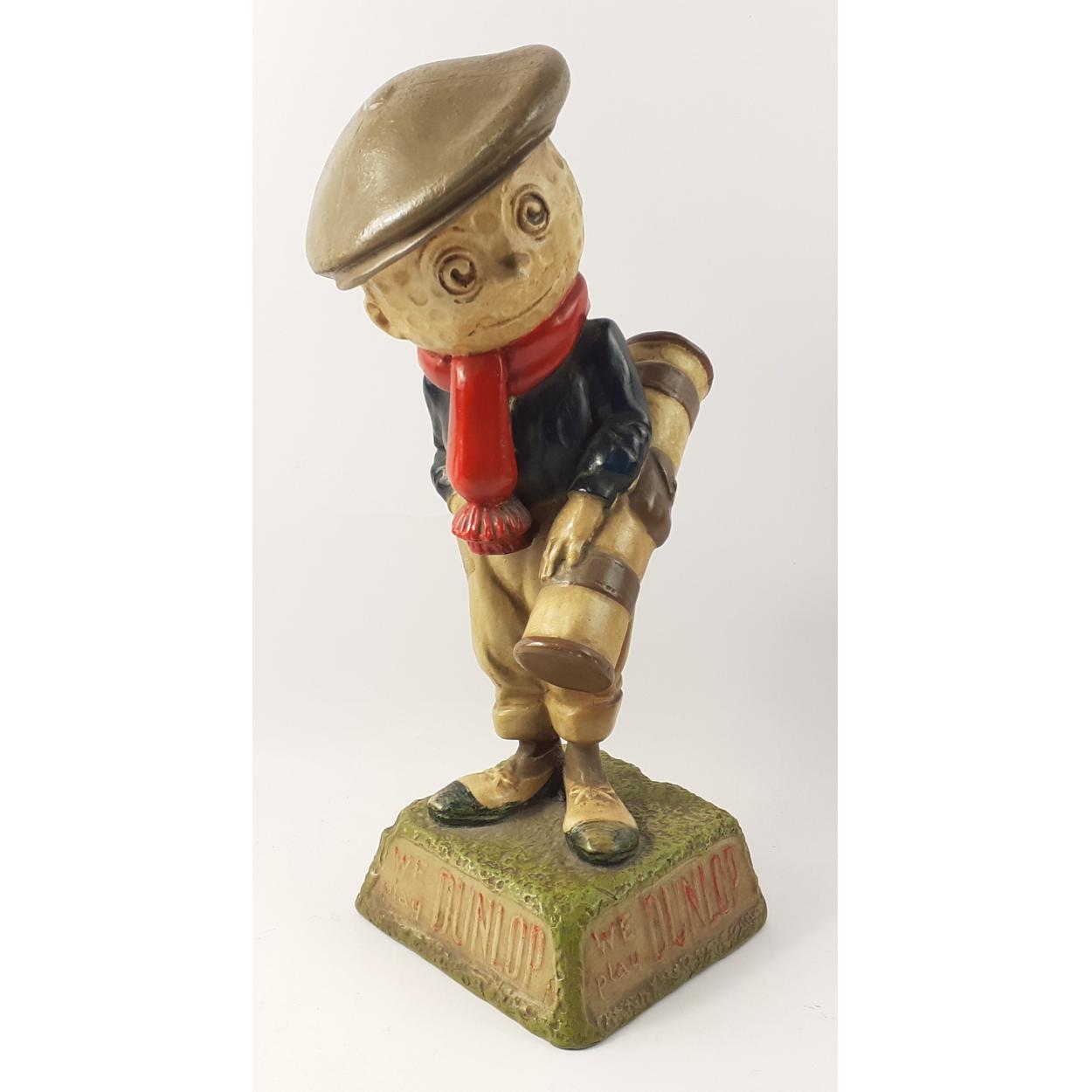 A rare antique plaster 'WE PLAY DUNLOP' golf advertising caddy, circa 1950 standing approx 40cm tall. These figures were given to British golf club professionals by Dunlop as a counter top display to advertise their golf balls